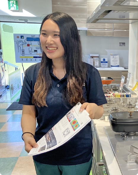 私はビジネスマナーや電話対応に自信がなく、入社前はとても不安でした。しかし入社直後の大阪ガスグループでの合同研修にて何度も練習させていただいたので、今では自信をもってお客様対応することができています。現在の業務では、広告用のチラシを企画、作成しているのですが、何度もメーカーさんとやり取りをする中で今では苦手意識なく電話対応もできているので、私も社会人になったなという実感が湧いてきます。